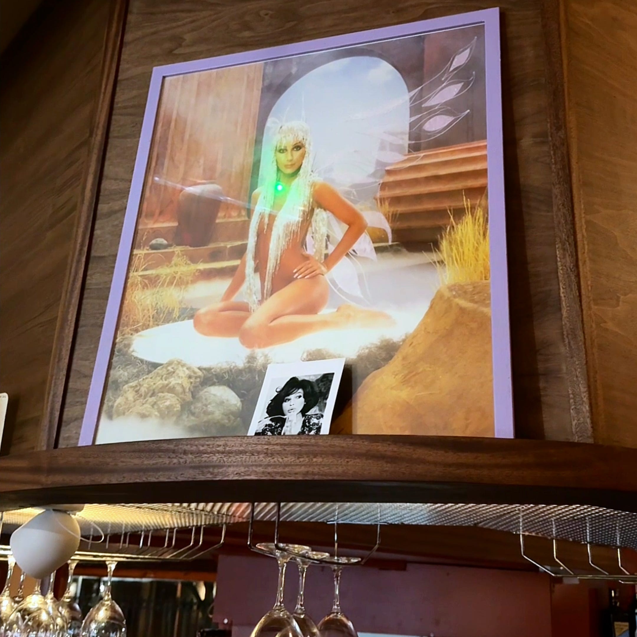 Tonight, I am joined by my cousin, who is waiting, poised with a drink. We could linger in the pub, but instead we progress. Dara beams broadly from her perch, overseeing everything. All I care about in the handsome dining room is the diva who surveys the business from on high. Not Dara, nor Madonna in a sacred niche. Instead the chosen icon is a nude photo of Cher, who wears a long glitter wig to cover her dignity. A late-70s photo with that Vaseline-smeared-on-the-lens soft glow. We settle in for the Emilia-Romagna led menu. If Italy is a foot, the region is the buttock crease of Italy up in the North-West. What a lovely place to be for the night.